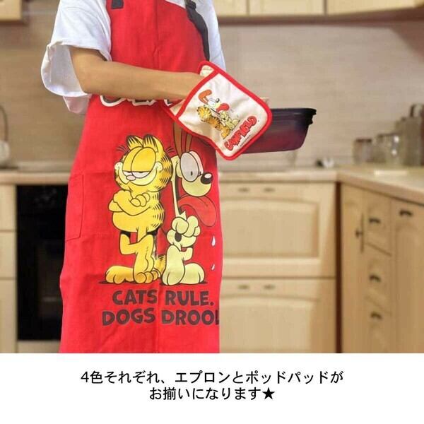 首紐は調節可能で動きやすく、シワになりにくい丈夫なコットン生地で作られたエプロンです!大きいプリントが撥水加工になっているので、濡れや汚れにも強くてGOOD!右脇にポケットも付いているので、使い勝手も◎!4カラーに様々なGARFIELDがデザインされ、どれも可愛くて選ぶのが大変ですね〜キッチンやお掃除、D.I.Yやガーデニングなどに活躍すること間違いなし!プレゼントにも喜ばれるアイテムです♪
