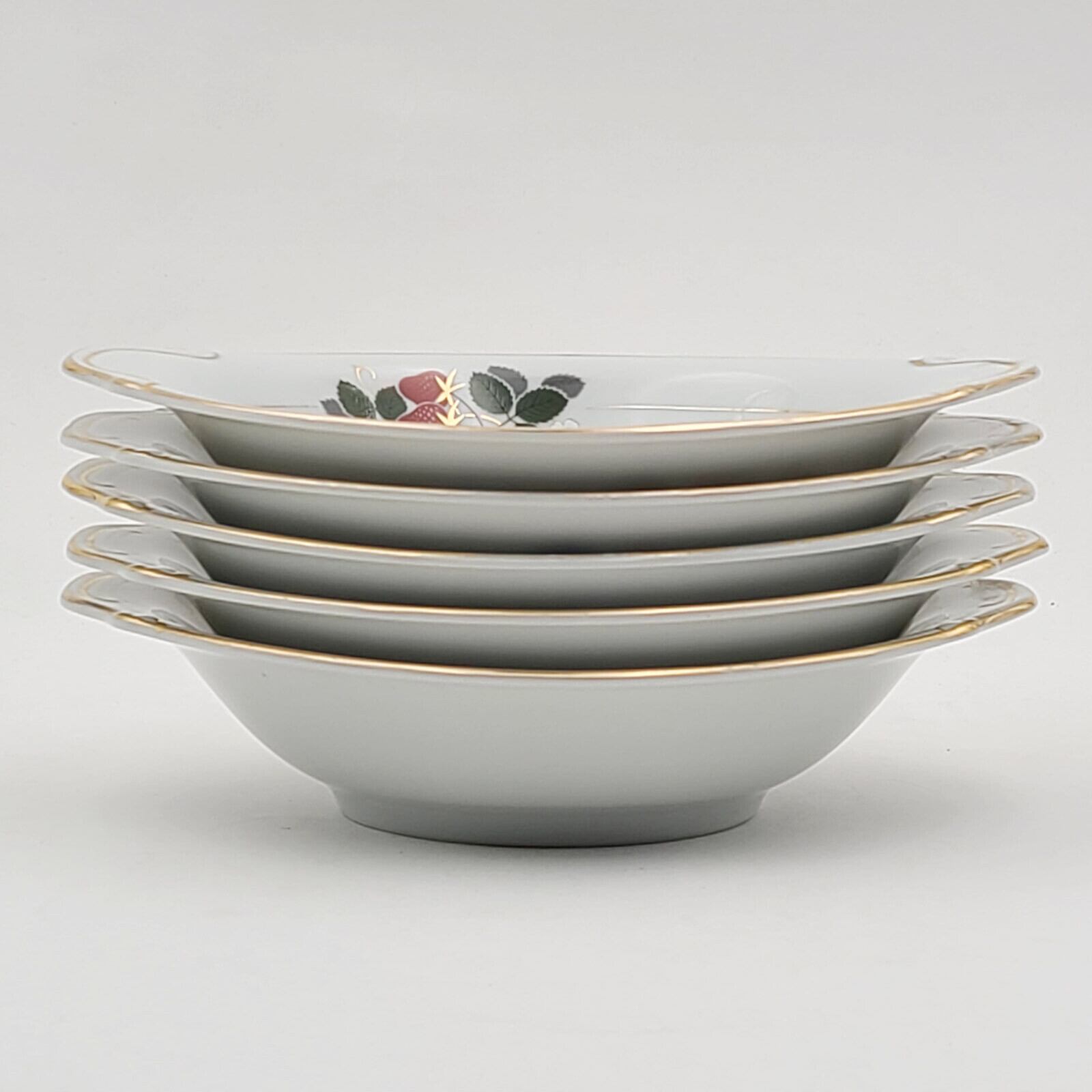 昭和レトロな洋食屋さんを思わせるカレー皿です。金のライン、いちご柄がかわいいうつわです。コロンと丸みのある形状でカレーやシチューなどのお料理におすすめです。