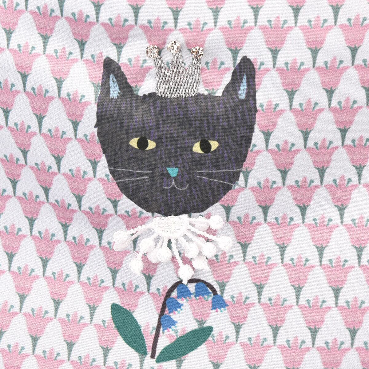 光沢のあるやわらかな手触りの良いサテン生地に、少しだけレトロ感ただよう砂糖菓子色のプリント模様。ラインストーンを縫いこんだキラキラな冠をかぶった黒猫の「みつまめプリンセス」がキュートで魅力的です。内側はどれもはっとするエメラルドグリーンの裏生地づかいにご注目。