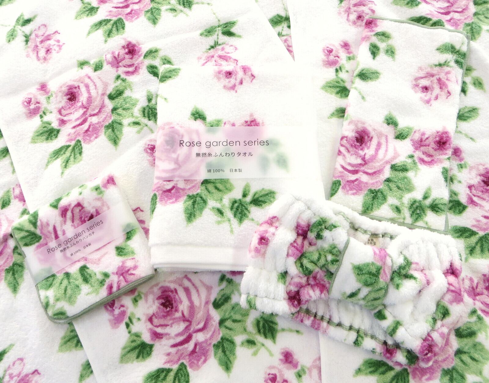 綿花そのものを感じさせるやわらかな風合いが無撚糸タオルの魅力。無撚糸(撚りをかけていない糸)で織り上げたタオルを使用した製品です。ふわふわの仕上がりとたっぷりの吸水性が自慢です。無撚糸タオルのイメージに合わせたやさしいカラーのバラ柄です。