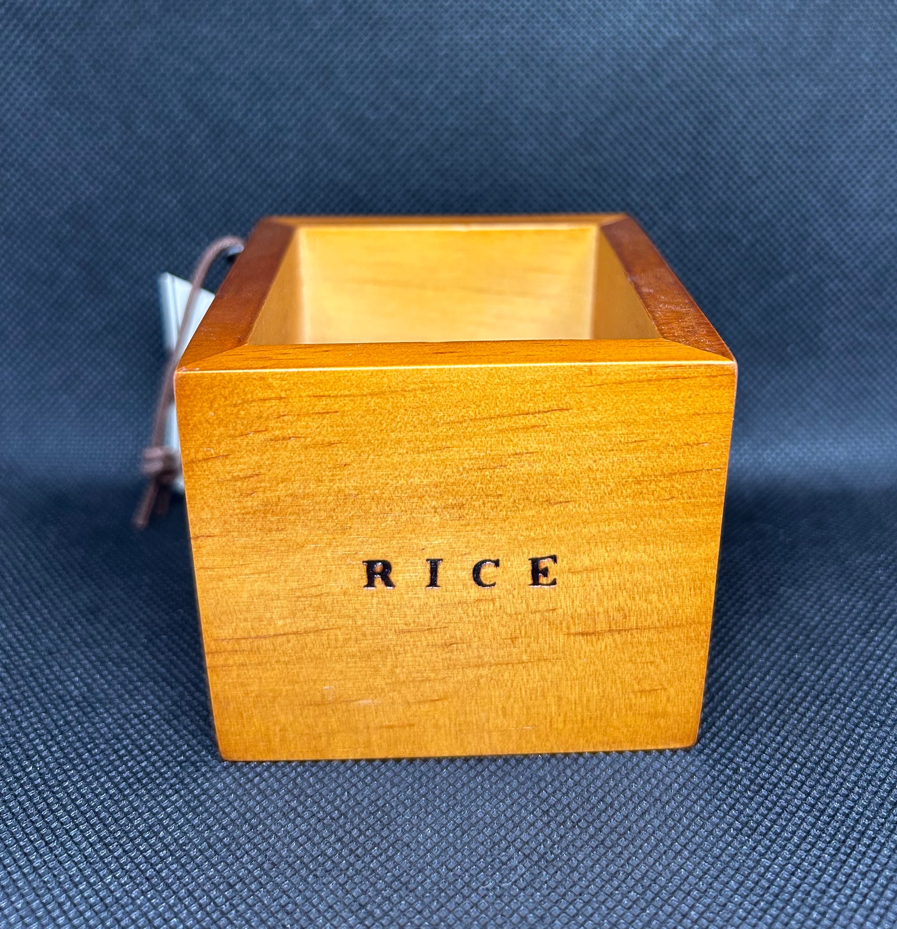 一合升の形のライスメジャーは紐付きだから手に取りやすい場所に吊るして使えます。半合を計る時は升を斜めにして対角線で計れます。